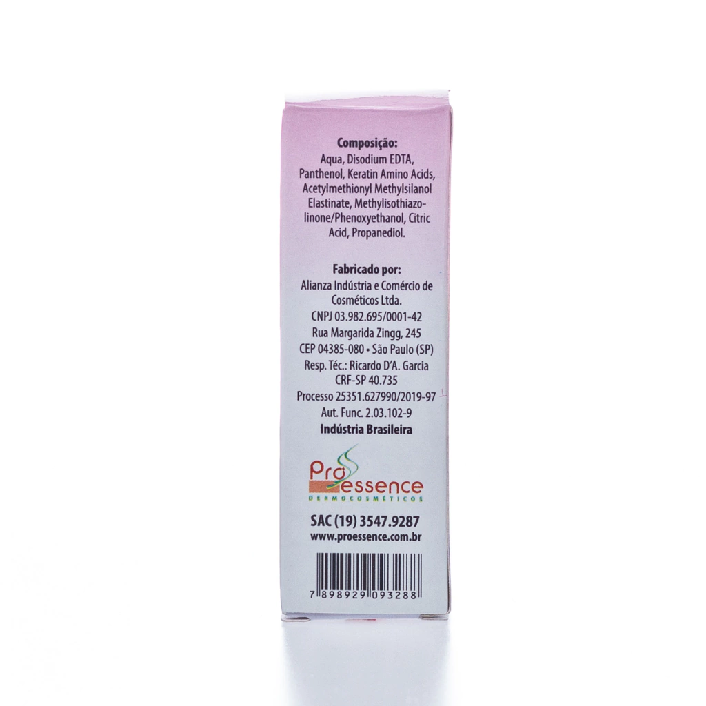Água, EDTA Dissódico, Pantenol, Aminoácidos de Queratina, Acetilmetionil, Metilsilanodiol Elastinato, Metilisotiazolinona, Fenoxietanol, Ácido Cítrico, Propanodiol.